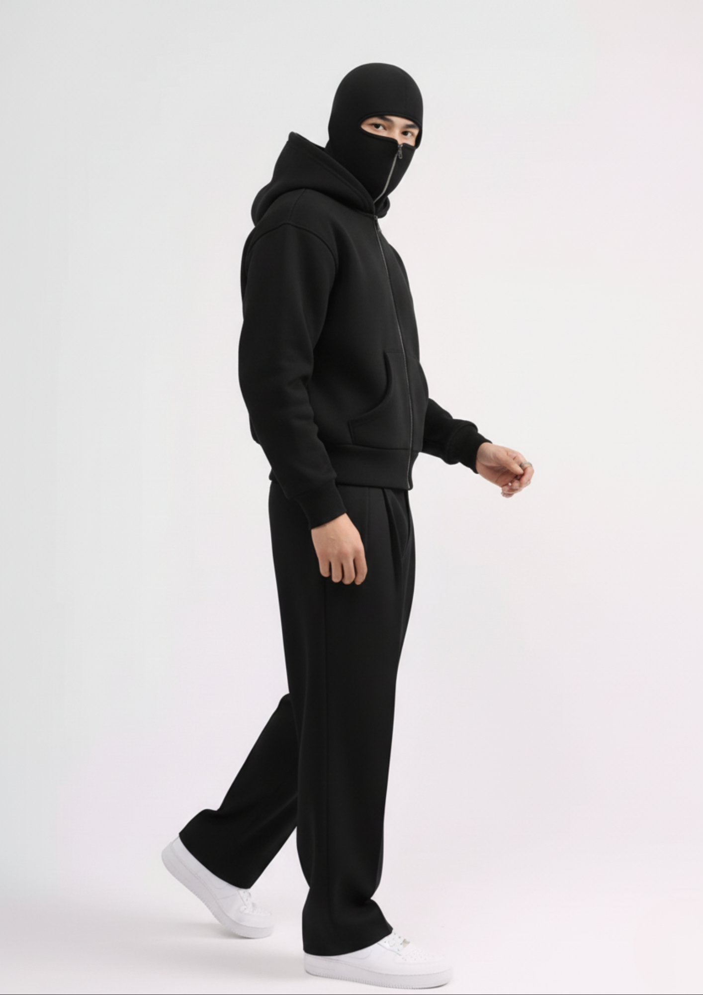 Style Tip: Achieve the pictured all-black tactical look by pairing it with black fitted denim or cargo pants and crisp white sneakers for contrast. For a more casual vibe, wear the balaclava down and pair the hoodie with light-wash jeans and combat boots.